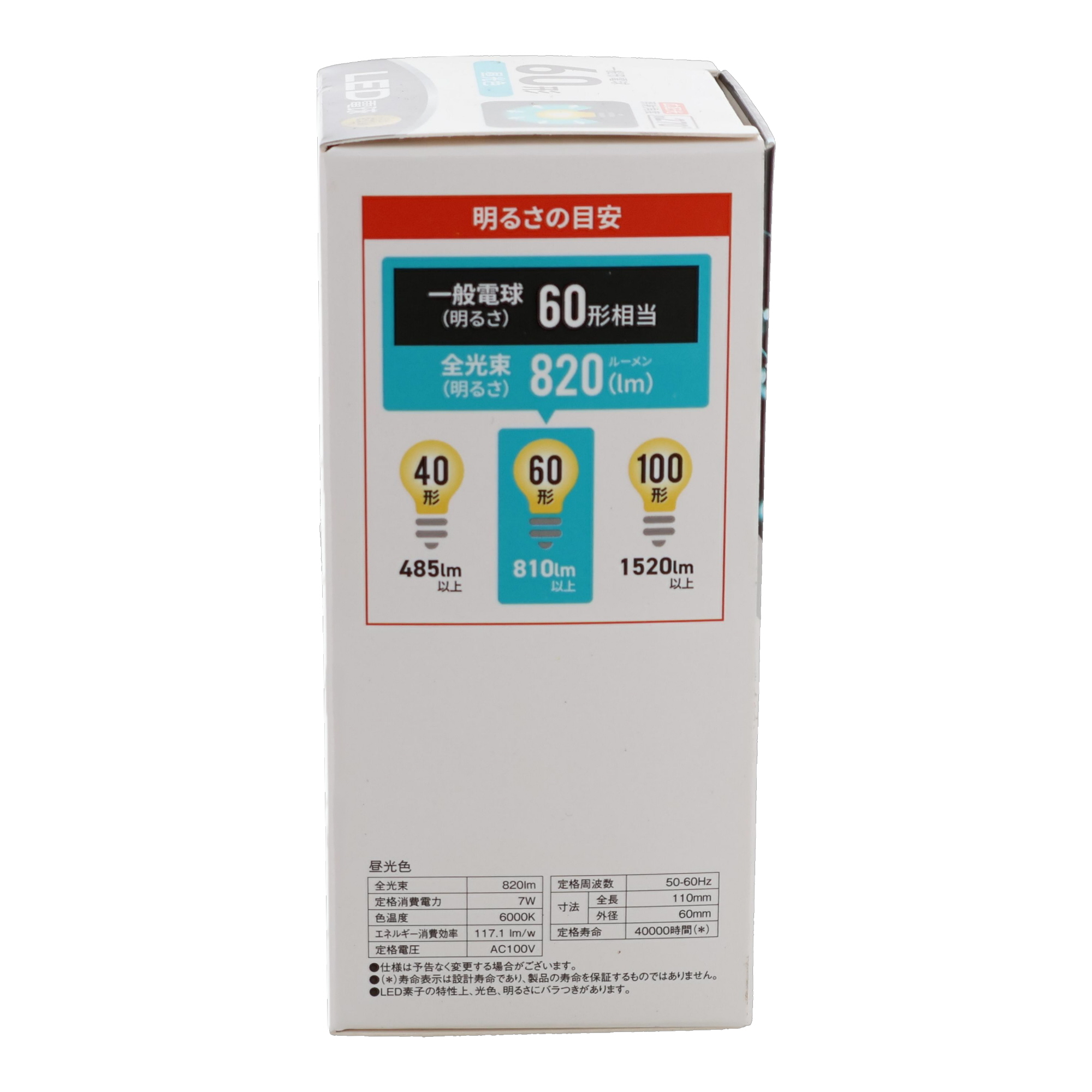 ●全光束:820lm●定格消費電力:7W●色温度:6,000K ●エネルギー消費効率:117.1lm/w●定格電圧:AC100V ●定格周波数:50/60Hz●定格寿命:40,000時間 ●本体サイズ:(全長)110mm(外径)60mm