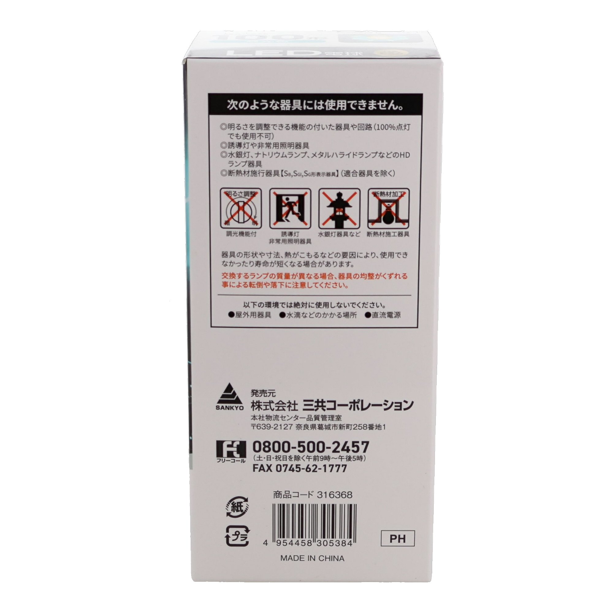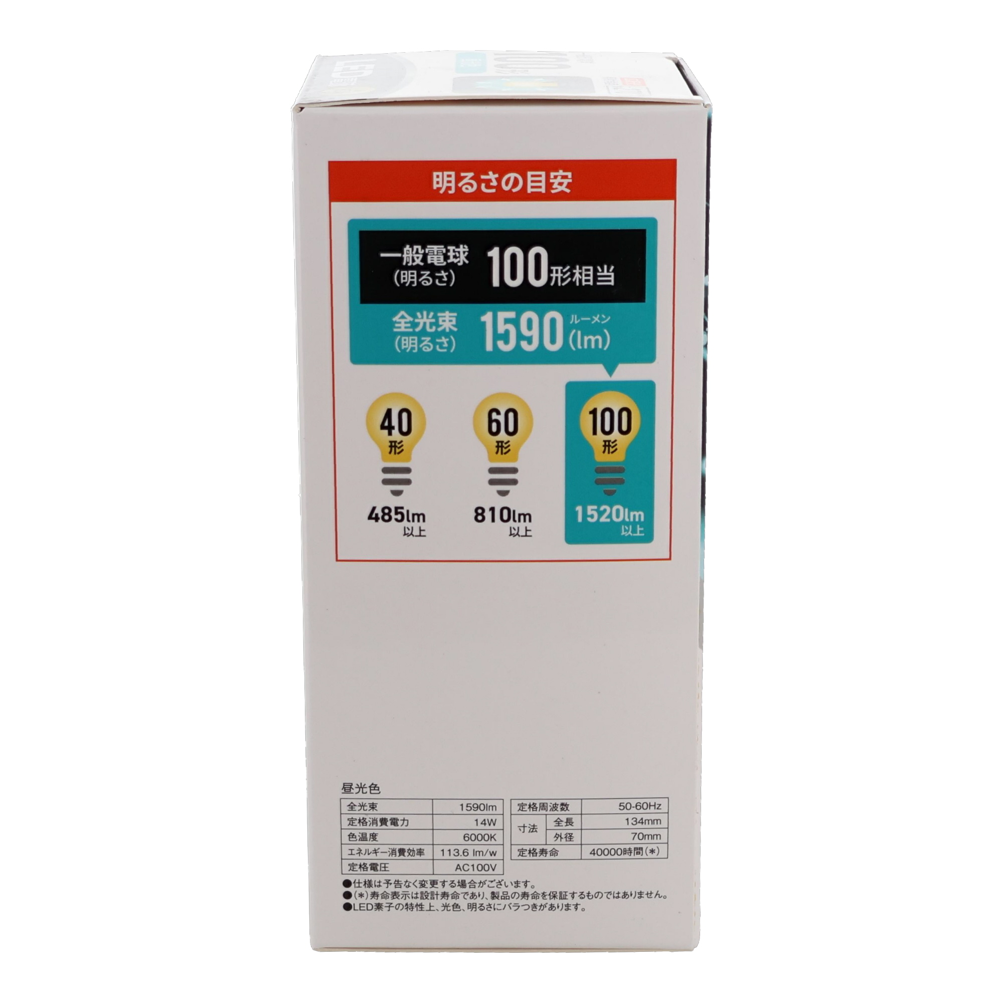 ●全光束:1590lm●定格消費電力:14W●色温度:6,000K ●エネルギー消費効率:113.6lm/w●定格電圧:AC100V ●定格周波数:50/60Hz●定格寿命:40,000時間 ●本体サイズ:(全長)134mm(外径)70mm