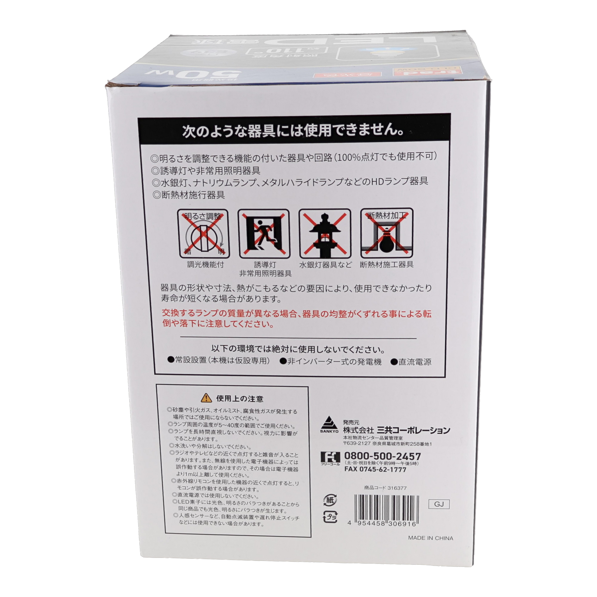 ●電圧:85-265V ●周波数:50/60Hz ●消費電力:50W ●全光束:6000lm ●照射角度:110° ●色温度:6000K ●防水レベル:IP65 ●口金サイズ:E39 ●LED寿命:約40000時間 ●本体サイズ:(全長)230mm(外径)160mm