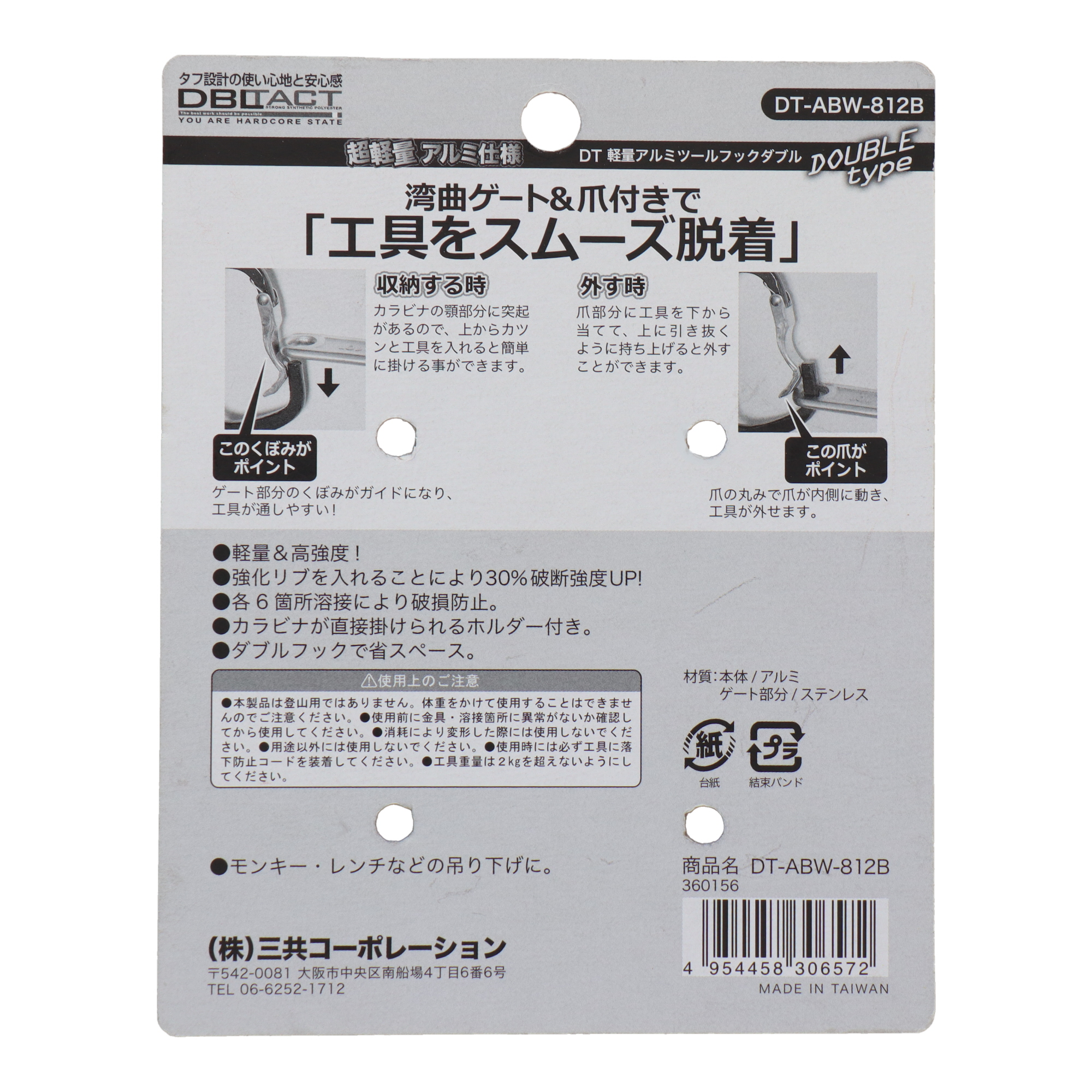 DBLTACTDT-AHB-811G 軽量アルミツールフック<湾曲ゲート×爪付き> ガンメタ