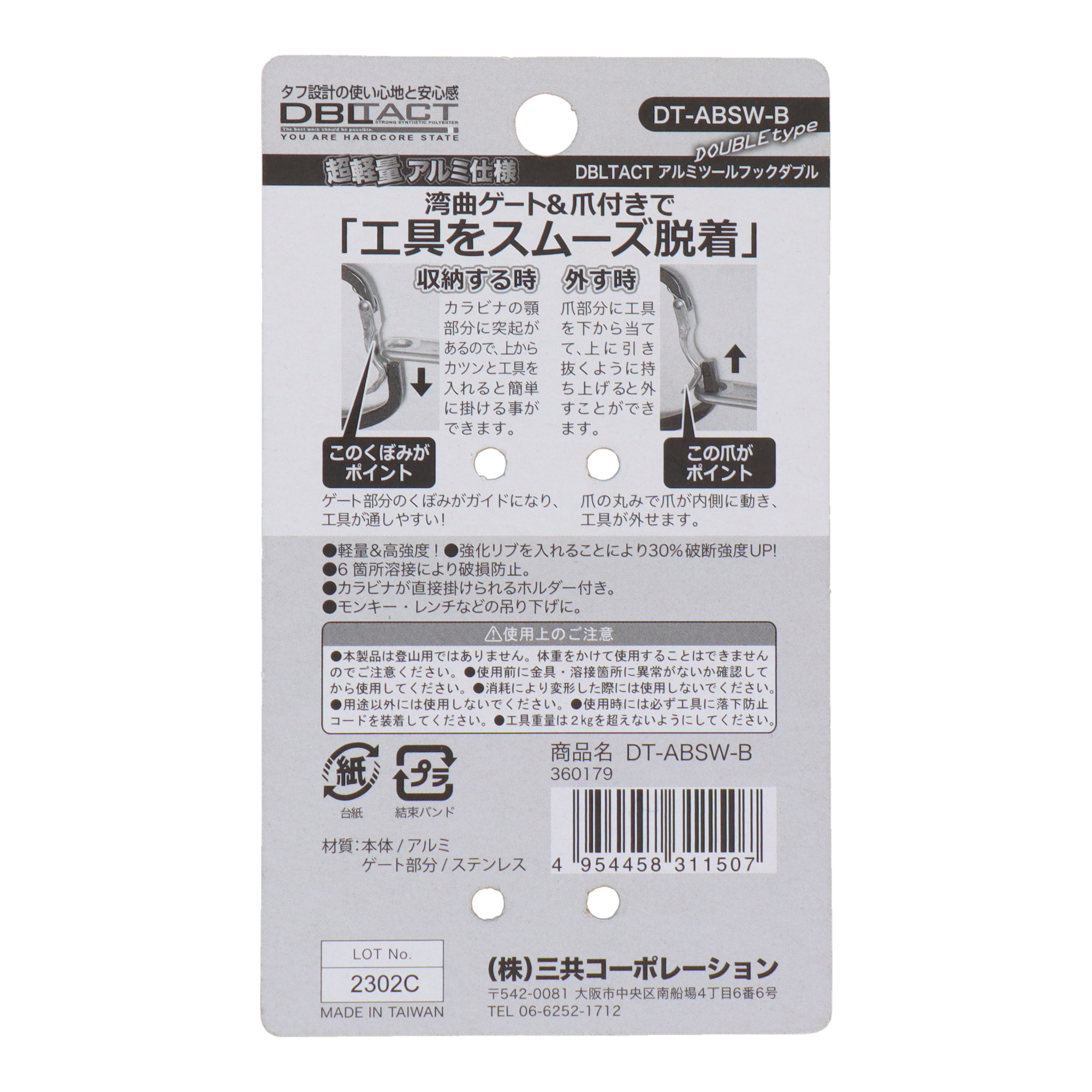 DBLTACTDT-ABS-G 軽量アルミツールフック 湾曲ゲート×爪付き ガンメタ