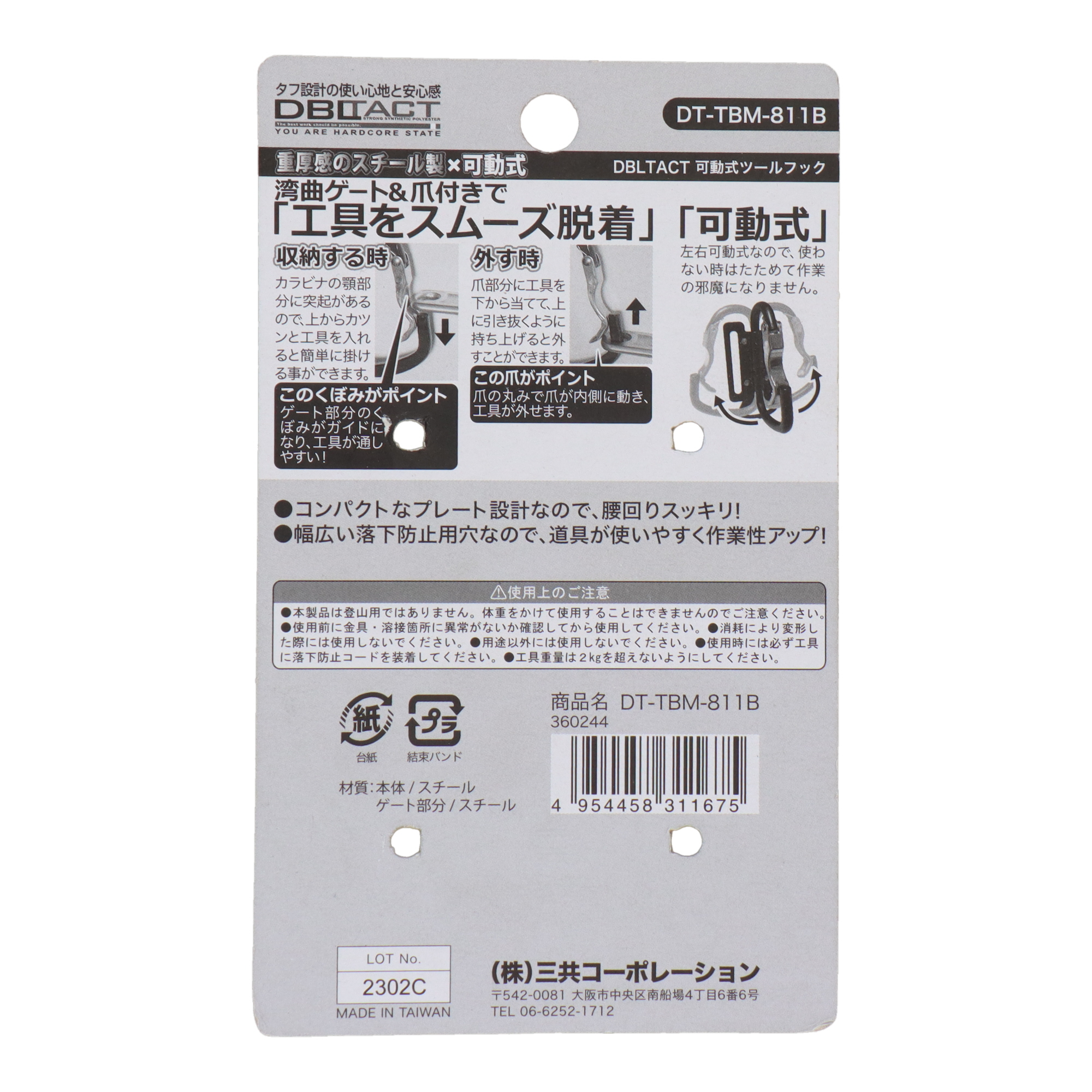 DBLTACTDT-TBM-811G 可動式ツールフック 湾曲ゲート×爪付き ガンメタ